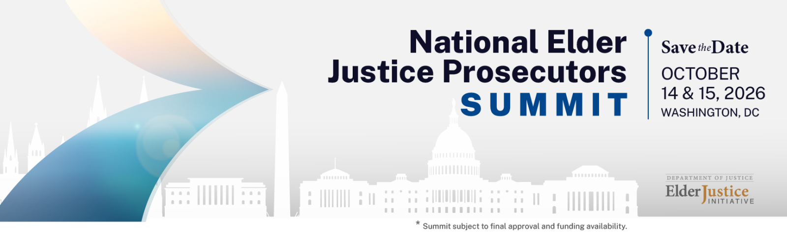 The Department of Justice’s Elder Justice Initiative (EJI) is planning a National Elder Justice Prosecutors’ Summit, scheduled for October 14–15, 2026, in Washington, D.C. (pending final funding approval).